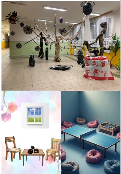 Pingpong (máme ve škole), sedací pytle, stolní fotbal, stoly a židle. Atrium je v zimě nebo při nepřízni počasí zavřené. Rádi bychom měli i jiné místo k potkávání. Pro 2.stupeň při vyučování a odpoledne o družinu. Do atria bychom pořídili: 11 sedacích pytlů, fotbálek a 3 sety stolů se židlemi.